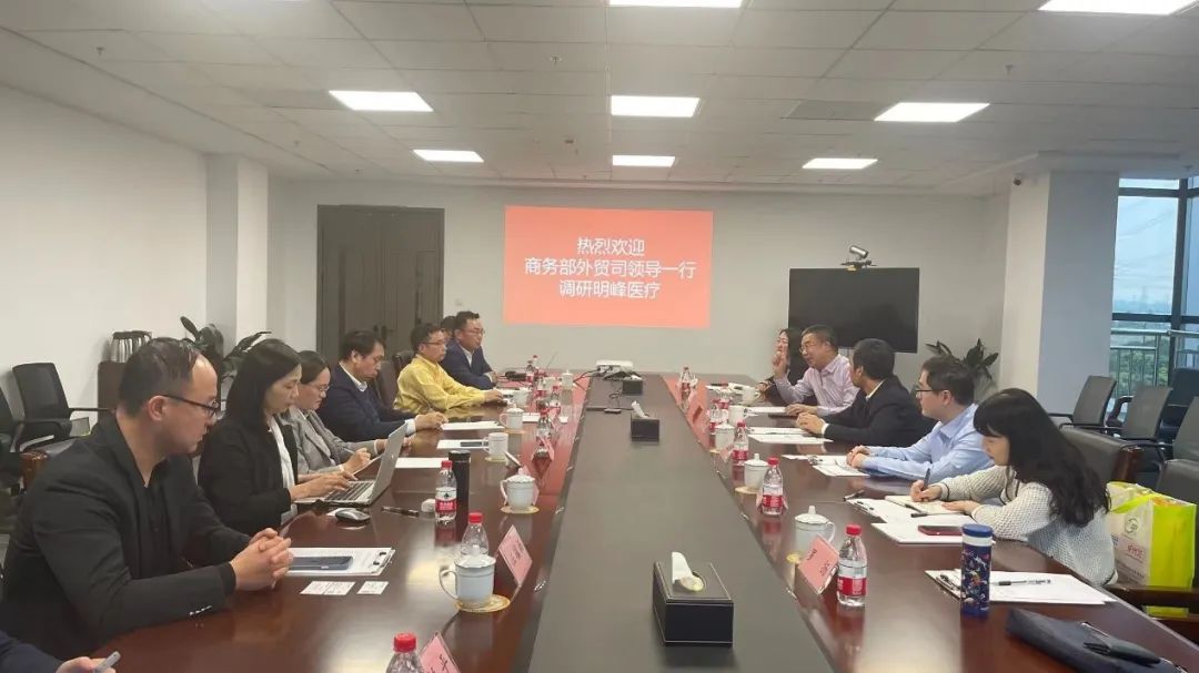 4月11日,商務(wù)部對外貿(mào)易司、中國醫(yī)藥保健品進出口商會、浙江省商務(wù)廳和錢塘區(qū)管理委員會等一眾領(lǐng)導(dǎo)前往明峰醫(yī)療位于錢塘區(qū)醫(yī)藥港的新總部大樓進行調(diào)研。