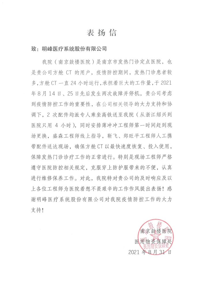 近日,明峰醫(yī)療收到了一份來自南京鼓樓醫(yī)院的表揚信。感謝明峰醫(yī)療售后服務(wù)的快速響應(yīng)!感謝工程師們在疫情期間不畏艱辛穿防護服維護設(shè)備!感謝明峰醫(yī)療一直以來對該院疫情防控工作的大力支持!